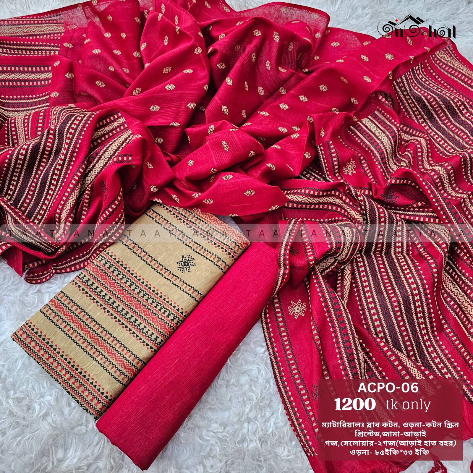 ওড়না- কটন স্ক্রিন-প্রিন্টেড।জামা-২.৫ গজ,সেলোয়ার-২গজ (আড়াই হাত বহর) ।