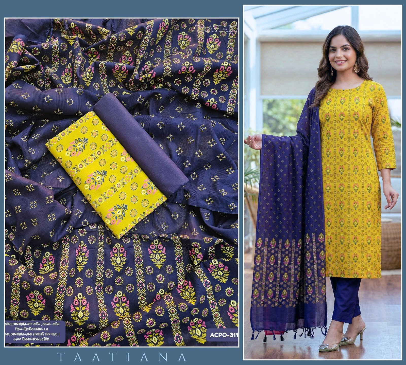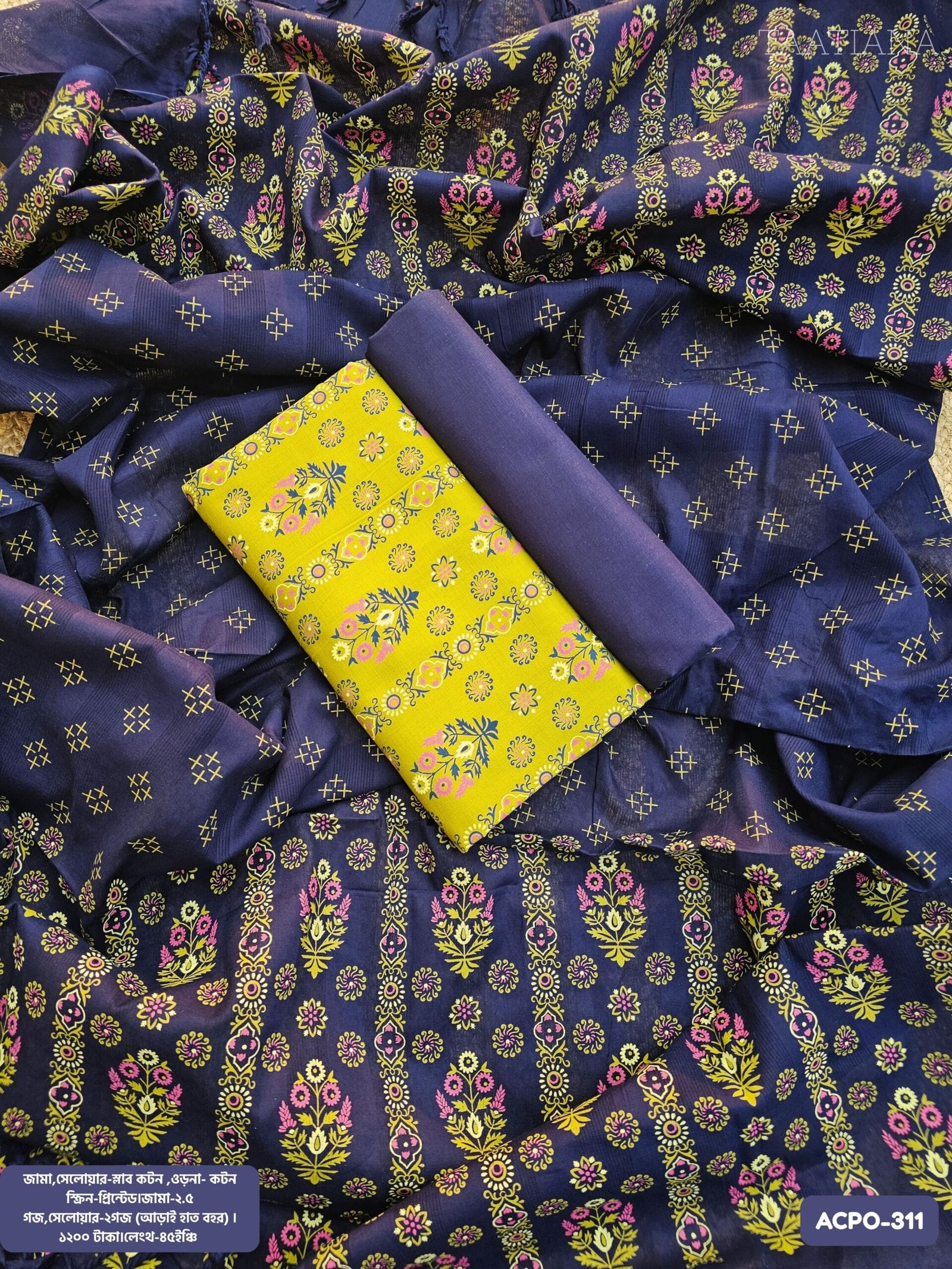 ওড়না- কটন স্ক্রিন-প্রিন্টেড।জামা-২.৫ গজ,সেলোয়ার-২গজ (আড়াই হাত বহর) ।
