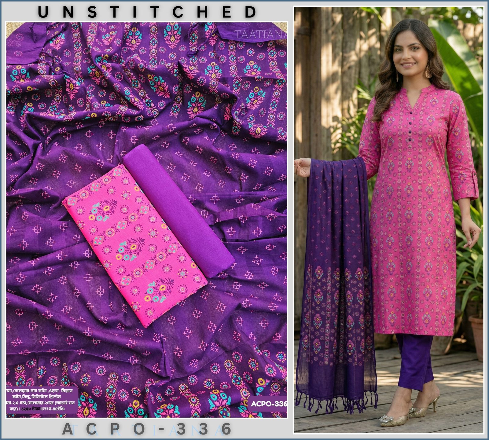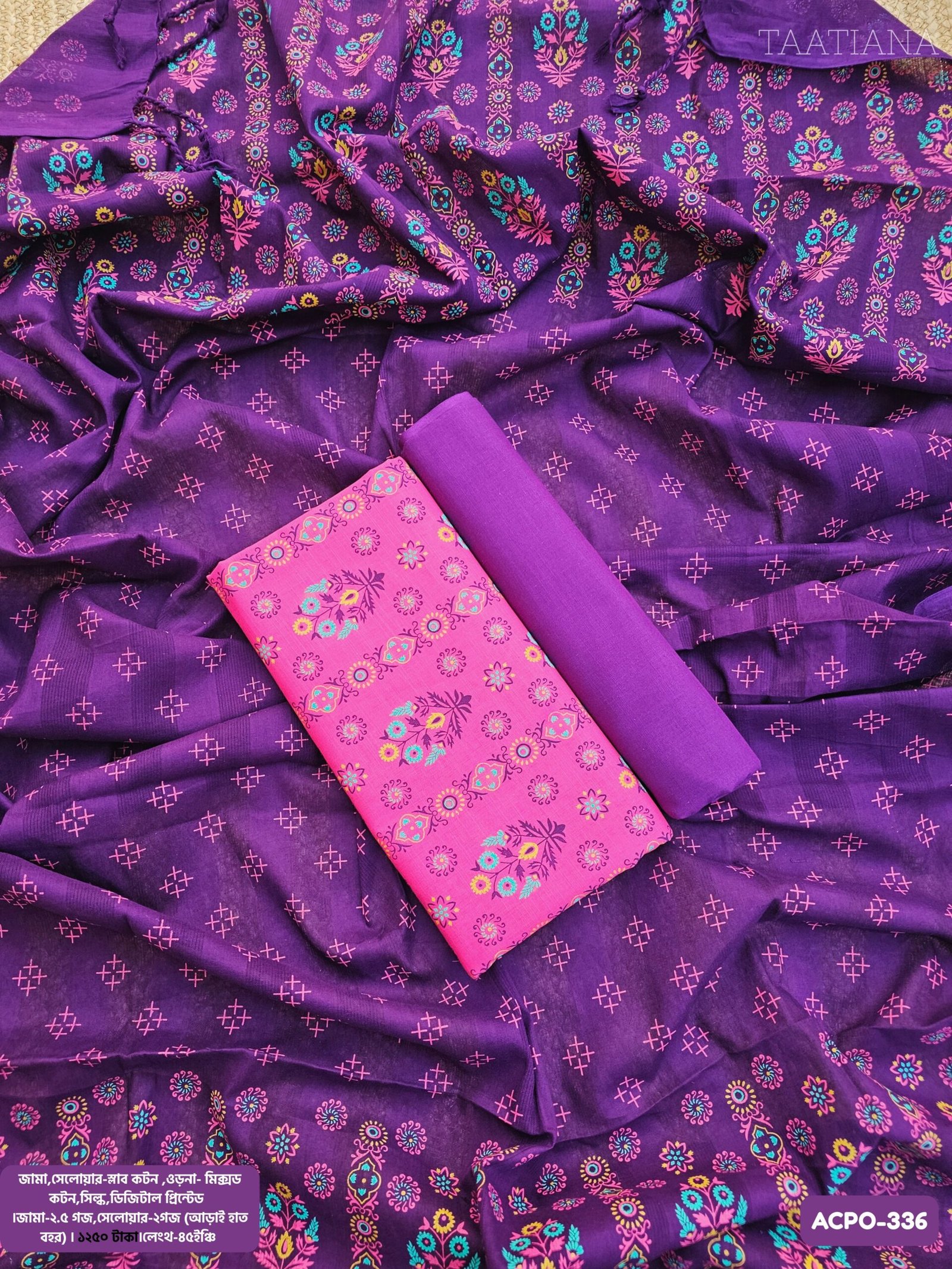 ওড়না- কটন স্ক্রিন-প্রিন্টেড।জামা-২.৫ গজ,সেলোয়ার-২গজ (আড়াই হাত বহর) ।