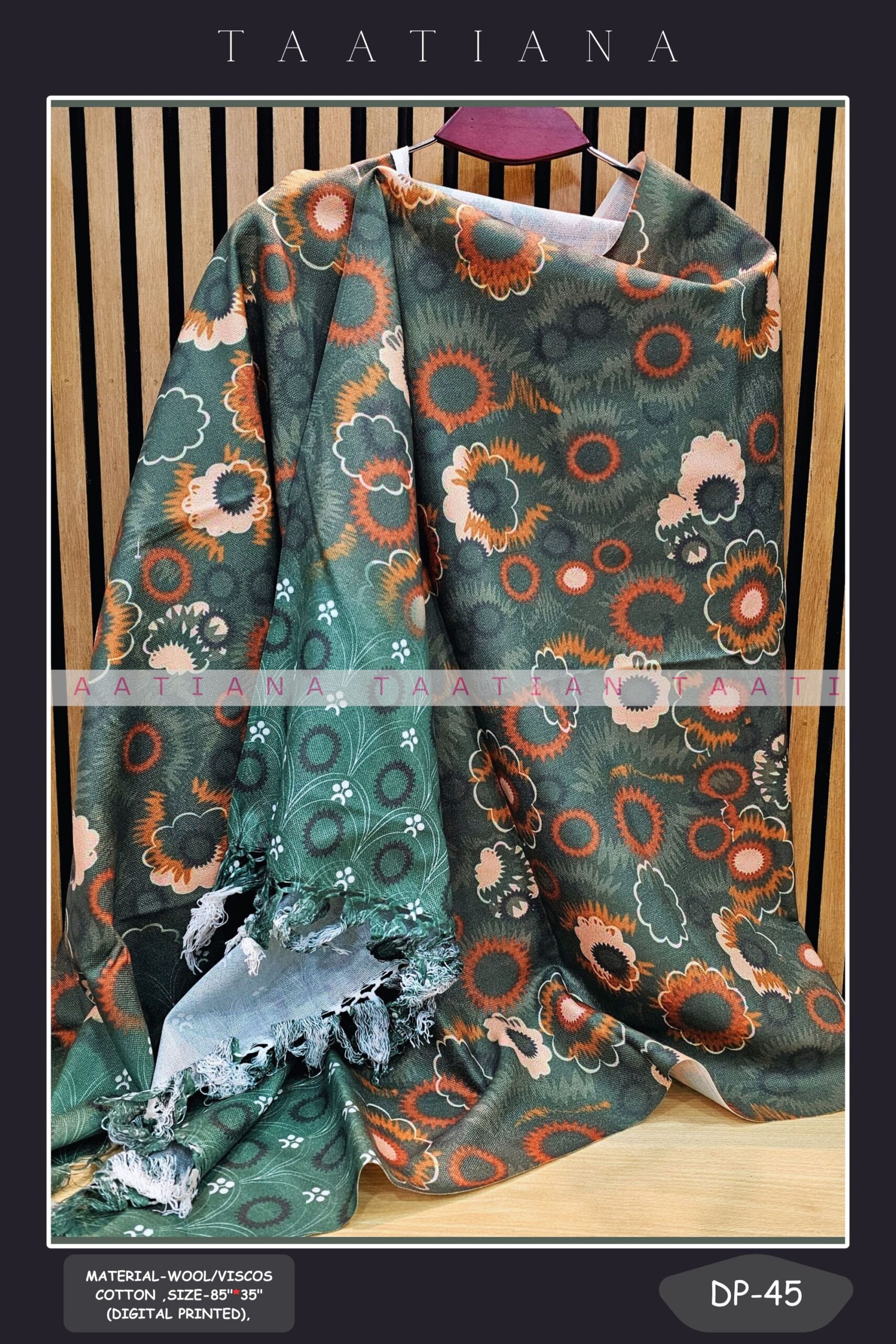 তাঁতে বুনা ওল/ভিস্কস, ডিজিটাল প্রিন্টেড। লম্বাঃ ৮৫ ইঞ্ছি, চওড়াঃ ৩৪ ইঞ্ছি